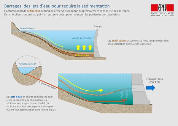 Une équipe de l’EPFL a développé un dispositif ingénieux de jets d’eau sous-marins qui, en provoquant des tourbillons, maintient les sédiments les plus fins en suspension et permet de les évacuer facilement lors du turbinage. Grâce à ce procédé, les réservoirs gagneraient en longévité, car il empêche une partie des sédiments de se déposer et pourrait même remettre en suspension les dépôts déjà installés. La recherche a été publiée dans Chemical Engineering Science et dans Journal of Hydraulic Engineering.