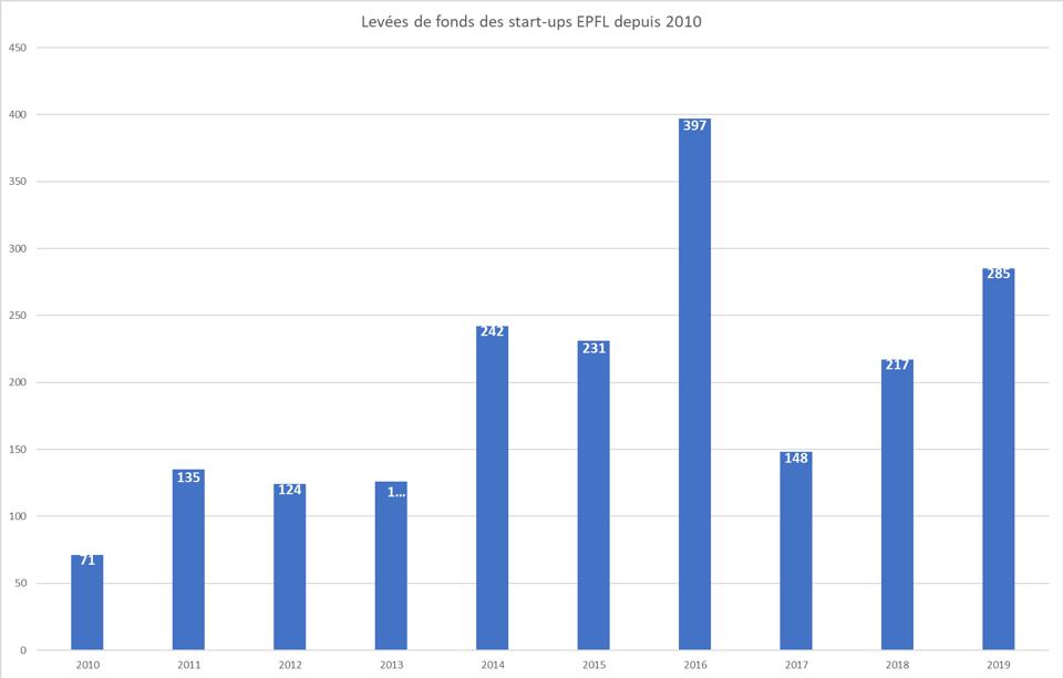 Le cap de 200 millions de francs d’investissements cumulés en un an a été passé pour la première fois en 2014. Depuis, le compteur s’est accéléré puisque le bilan a été par quatre fois supérieur aux 200 millions ces six dernières années, atteignant même plus de 390 millions en 2016 et plus de 280 millions en 2019. Cette augmentation est liée au nombre croissant de start-up créées, aux diverses aides au démarrage ainsi qu’à l’écosystème entrepreneurial du campus ainsi qu’à la présence de l’EPFL à de nombreux événements comme le CES de Las Vegas, ou le Bits&Pretzels à Munich. Mais plus largement, l’essor de la Suisse sur l’échiquier mondial des nations de start-up joue également un rôle. Classée dans le top 30 selon le rapport annuel de start-up Genome paru en mai 2019, elle est mentionnée parmi les écosystèmes à observer dans le secteur du DeepTech, soit les start-up basées sur des innovations de rupture. De plus, ensemble, Lausanne, Berne et Genève figurent à la 6ème place des écosystèmes dans le secteur des Sciences de la vie, devant ceux des Etats-Unis et de Londres.