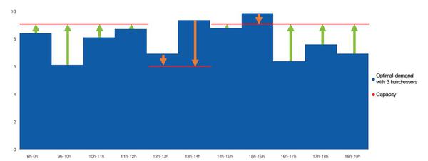 dynamic management of personnel capacity for an on-campus hairdresser with the aid of temporary price discounts. The team conducted a survey of about 120 consumers and was able to gather detailed information about gender-specific habits and preferences. Based on the empirical distribution of preferred time slots for haircuts, the team constructed a demand pattern for a typical day, including a demand curve for “classical haircut equivalents” allowing for the joint consideration of male and female haircuts. It was then possible to design an algorithm to significantly improve the match between available staffing capacity and actual demand.