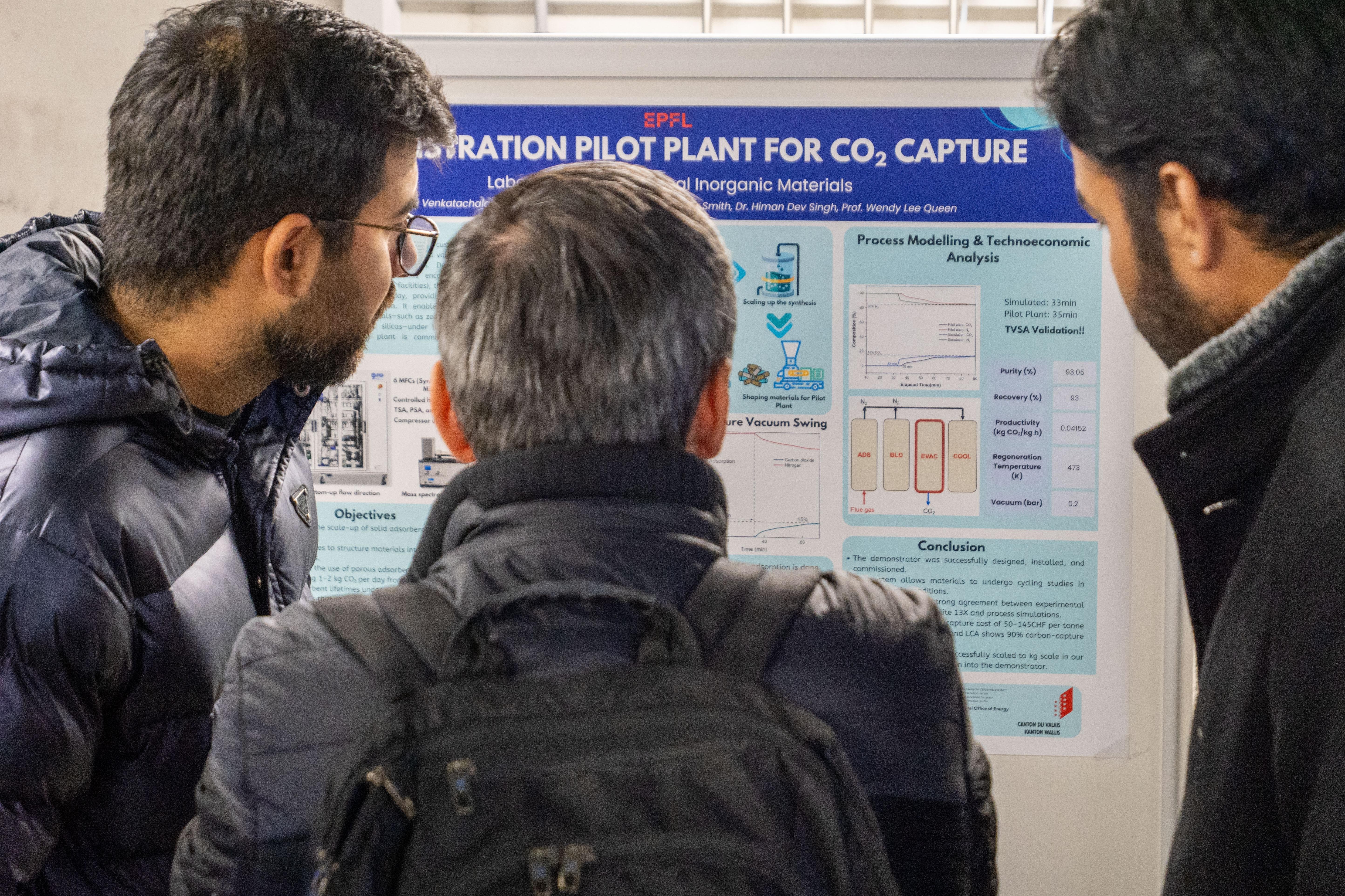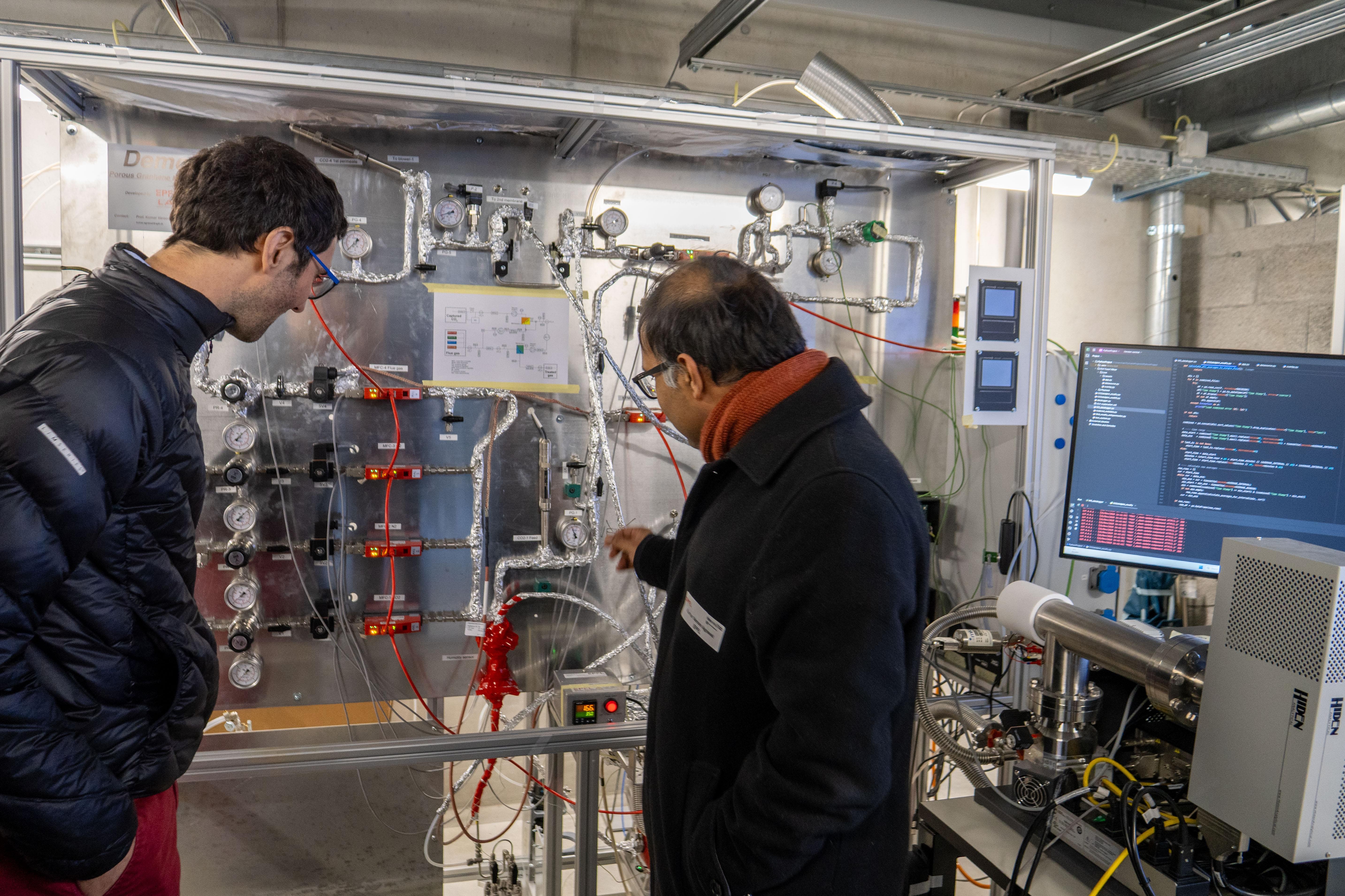 Carbon capture systems are critical components of our efforts to reach net zero. In the case of the demonstrator, carbon is captured right where it is emitted – before it’s released into the air – and then fed into the methanation reaction. This process draws on two pioneering technologies that came out of EPFL’s Valais-Wallis campus: porous graphene membranes for filtering CO₂, which were developed from the proof-of-concept stage to a full-scale prototype by EPFL Prof. Kumar Agrawal’s research group; and metal-organic frameworks that work like tiny sponges to absorb the filtered CO₂ in large amounts, created by EPFL Prof. Wendy Queen. After being chemically converted, the CO₂ is either stored or transported in liquid form.
