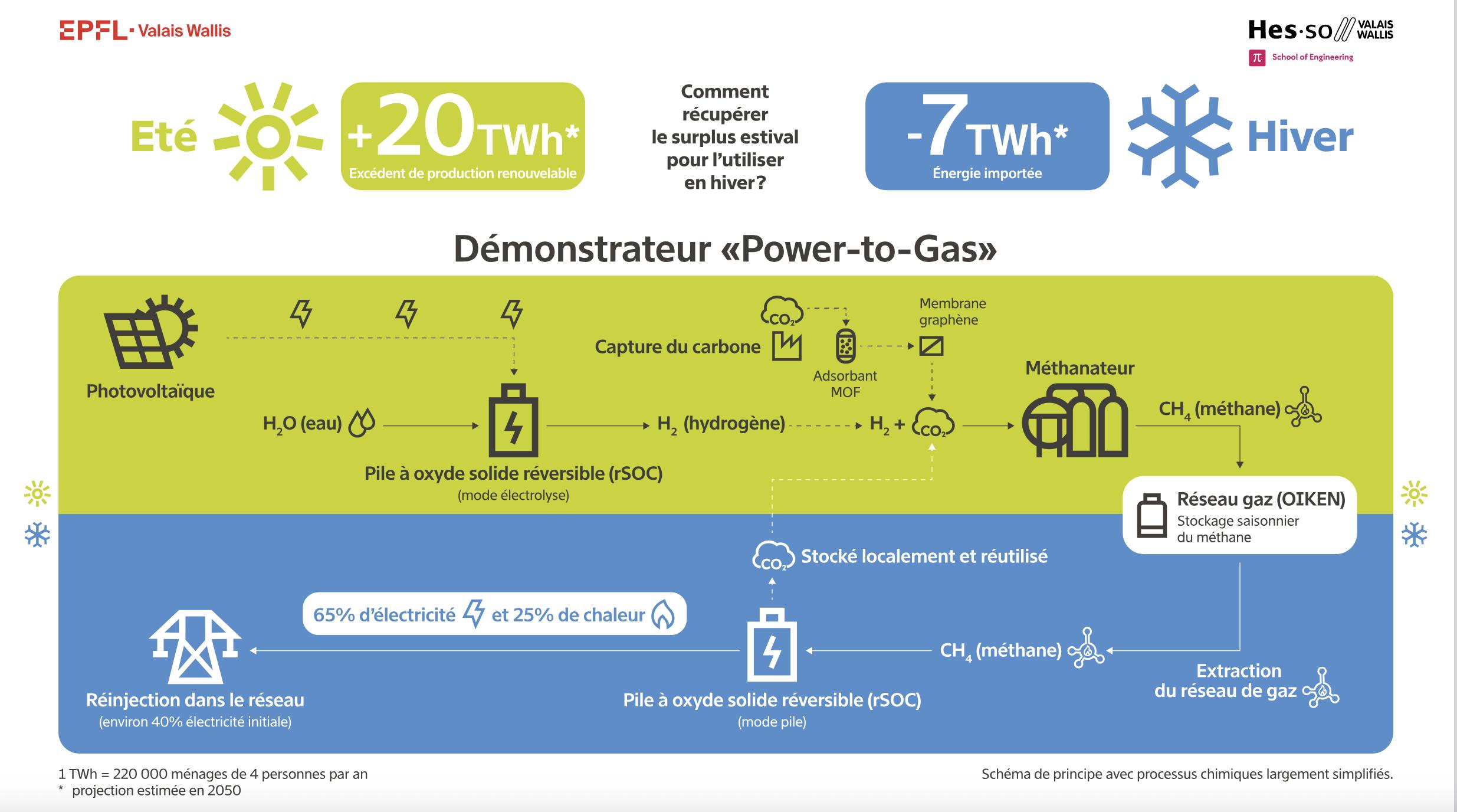 Power-to-gas systems involve converting electrical power into gas so that it can be stored and then deployed to fill seasonal gaps in renewable-energy generation (e.g., from wind turbines, solar panels and hydropower plants). The EPFL/HES-SO demonstrator provides a concrete solution whereby excess power generated in the summer is converted into either hydrogen (drawing on research done by senior scientist Jan Van Herle at EPFL and Prof. Christoph Ellert at HES-SO Valais) or methane (drawing on joint research by Van Herle and Jessen Page at HES-SO Valais). These gases can be stored at length or injected into the gas grid. When power is subsequently needed, such as during times of high demand in the winter, the process can be reversed to convert the gas into electricity or heat. Seasonal storage capabilities like those demonstrated here are essential for stabilizing power grids and securing Switzerland’s energy supply.