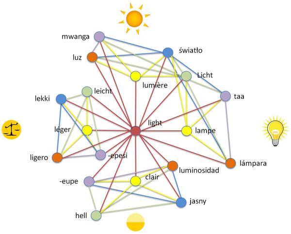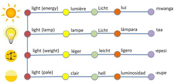 In the case of a multilingual dictionary, all of the meanings of words are theoretically linked together in all languages, which allows one to perform automatic verifications within the network of languages. Indeed, if "light" means "lumière" in French, but also "léger", then the equivalent words in German are "Licht" and "leicht". These two German words can then be cross-referenced to "light" in English while nevertheless maintaining the distinctions that exist in French or in other languages. Therefore, a multilingual dictionary would allow one to differentiate between the various possible meanings of a given word by deducing equivalencies in the other languages.