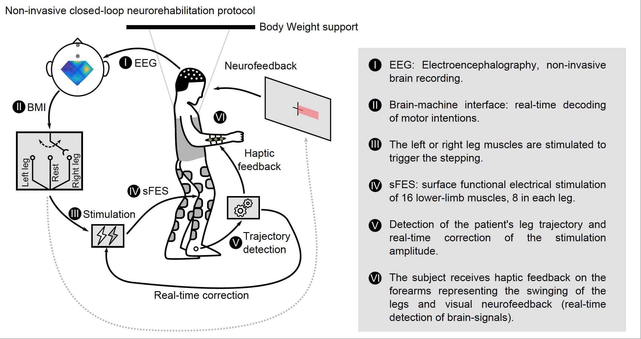 The patients wore an EEG headset with electrodes to record the brain’s electrical activity and detect movement intention. Eight electrodes were attached to each leg, stimulating the muscles involved in the walking process. After preliminary training, patients used their own brain activity to send electric impulses to the muscles in either leg.