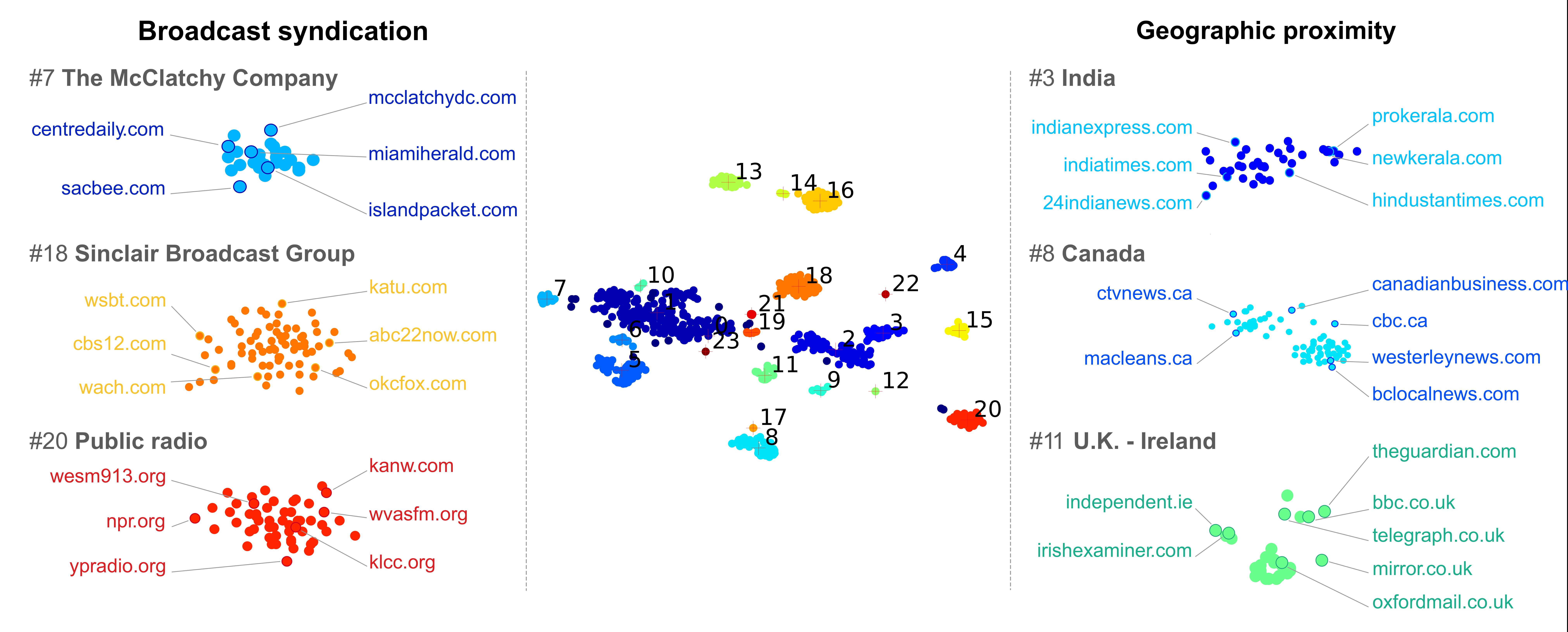 A Dynamic Embedding Model of the Media Landscape, Jeremie Rappaz, Dylan Bourgeois, Karl Aberer, The Web Conference 2019 (WWW '19) https://www.mediaobservatory.com/assets/papers/www19.pdf