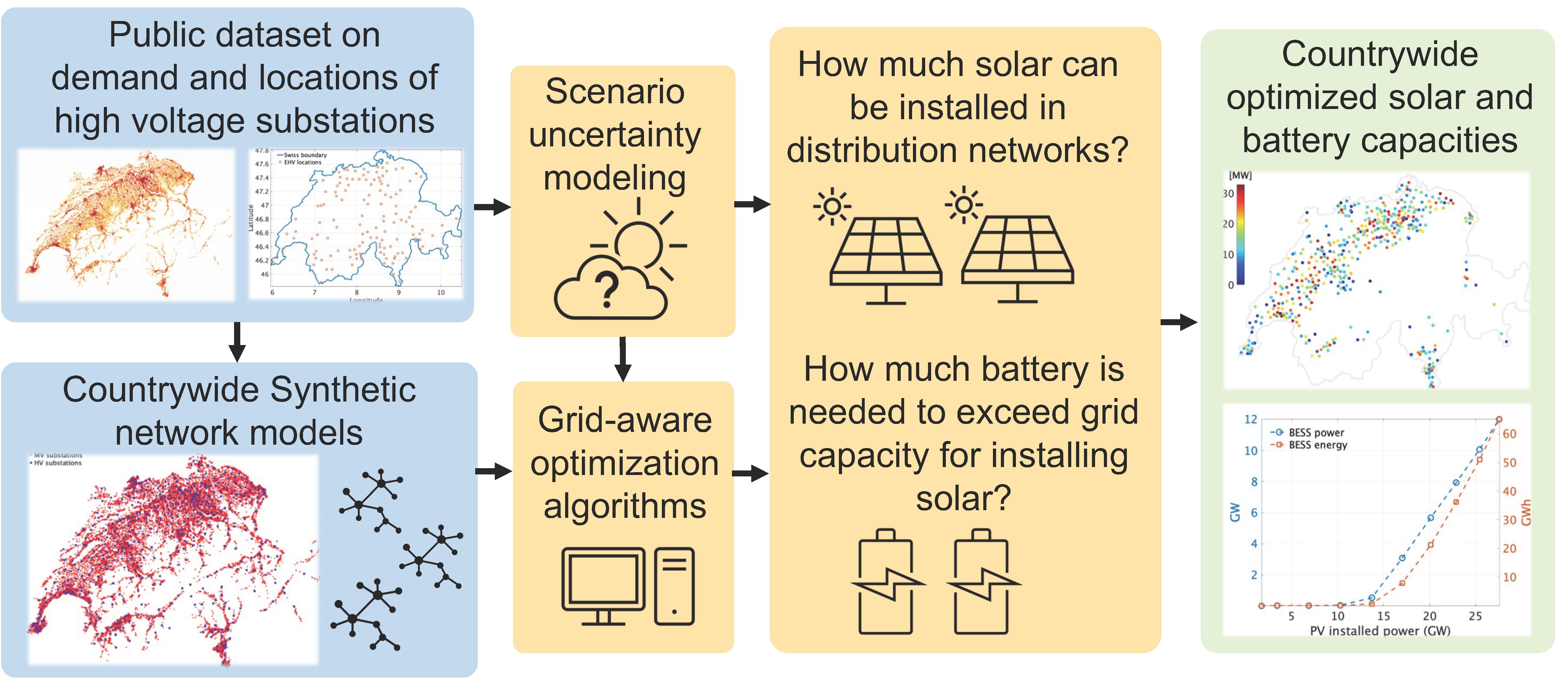 Finally, the thesis develops large-scale planning tools to assess countrywide PV hosting capacity and optimally allocate battery energy storage systems (BESSs). It is achieved by generating synthetic distribution network models, followed by grid-aware optimization of PV hosting capacity and BESS. The scheme is applied for the case of Switzerland to obtain countrywide cost-optimal integration of PV and BESS units.