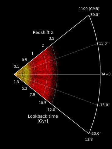 IMAGE: A slice through the largest ever 3D map of the Universe. Earth is on the left, and distance to the galaxies and quasars is labeled as either redshift (upper), or the age of the Universe when the light left the objects (lower). The locations of quasars (galaxies with supermassive black holes) are shown by the red dots, and nearer, lower luminosity galaxies mapped by SDSS are also shown (in yellow). As eBOSS continues to survey the sky over the next 3 years, the blank regions will be filled in with more galaxies and quasars. Credit: SDSS
