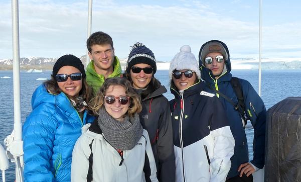 Les six étudiants EPFL embarqués à bord du navire polaire Professor Molchanov, de gauche à droite: Solange Leblois, Jocelyn Roth, Amélie Séchaud, Mélanie Gaillet-Tournier, Alexia Rousseau, Eric Sauvageat. ©A. Rousseau