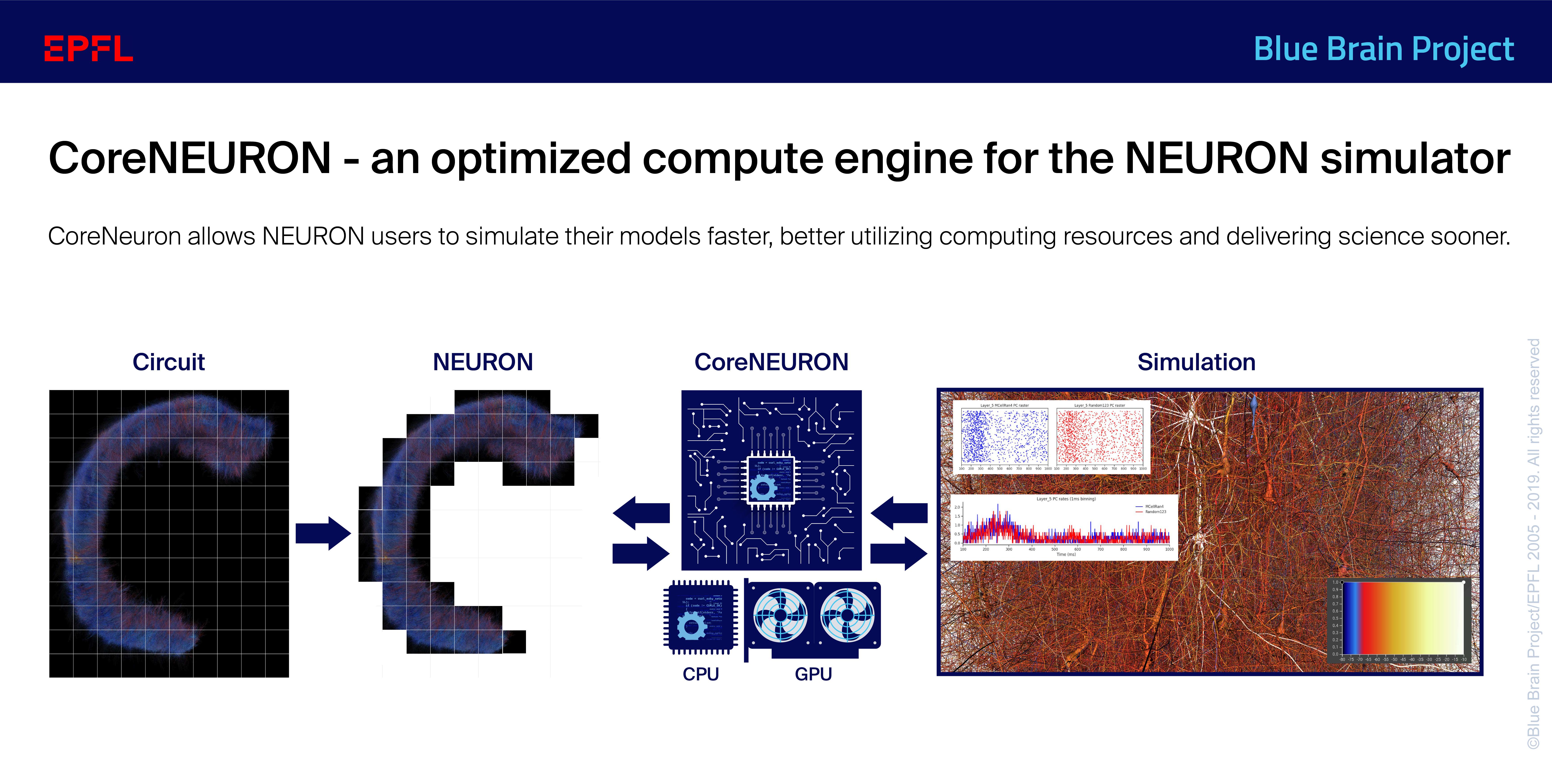 In order to improve performance and benefit from new computing architectures the EPFL Blue Brain Project has isolated the core functionalities of the NEURON simulator and optimized them into a new simulator engine CoreNEURON. In a paper published in Frontiers in Neuroinformatics, the Blue Brain explains how CoreNEURON helps existing NEURON users to simulate their models faster, better utilize computing resources and ultimately help to deliver science sooner.
