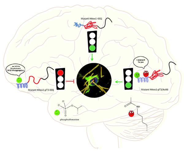 First, phosphorylation of threonine on position 3 (T3) stabilizes a helical formation of huntingtin’s first 17 amino acids, and interferes with its ability to aggregate. This could explain why this particular modification is reduced in Huntington’s disease and suggest that modulating the level of this modification could protect against HD disease.