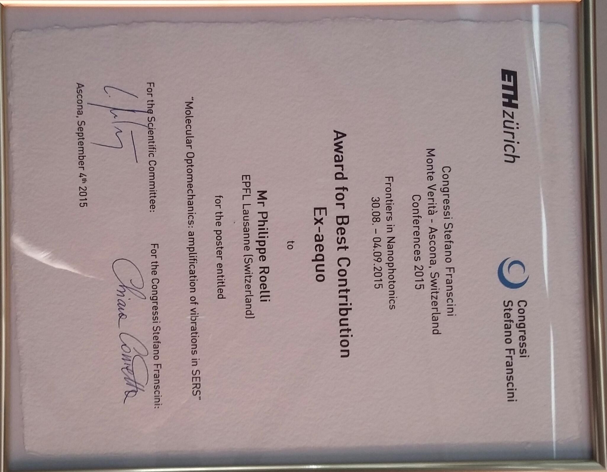 At the occasion of the conference "Frontiers in Nanophotonics", Philippe Roelli received the CSF sponsored award for young scientists for the best presentation at the conference (ex-aequo with Jan Mertens). His poster was entitled "Molecular Optomechanics: amplification of vibrations in SERS" and showcased a new activity in optomechanics conducted in the lab of Prof. Kippenberg, exploring the physics emerging from the interaction between molecular systems and optomechanical cavities.