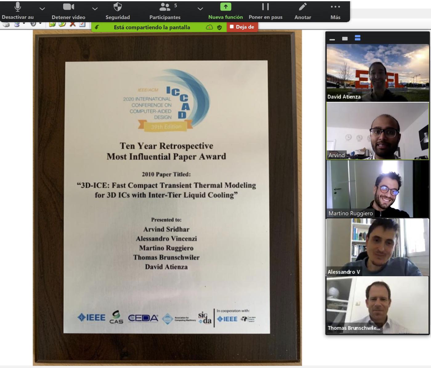 Presented at the IEEE/ACM International Conference on Computer-Aided Design (ICCAD) 2010, the research from professor Atienza and his team at ESL, in collaboration with IBM Zurich, on the design of open-source 3D Interlayer Cooling Emulator (3D-ICE) tool: 3D-ICE for compact transient thermal modeling of 2D/3D multi-processor system-on-chip (MPSoC) with liquid-cooling and other cooling technologies, has been awarded the ICCAD 2020 Ten Year Retrospective Most Influential Paper Award. This work was used in the design of Aquasar (the first chip-level water-cooled server by IBM), and 3D-ICE is currently a popular open-source tool used by more than 1500 scientific teams (both industry and academia) around the world. More information on this work and latest results can be found on ESL’s research line page here: Thermal, power and performance aware design of 2D/3D system-on-chip architectures