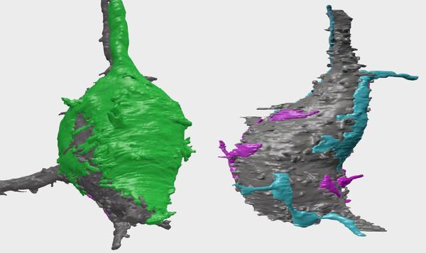 Les chercheurs ont ensuite reconstruit en trois dimensions les synapses, à partir de centaines de coupes passées sous le microscope électronique. Au lieu d’un unique et massif Calice de Held, qui englobe presque la moitié du neurone, l'image 3D montre clairement plusieurs synapses, plus petites. «Cela montre que le processus impliquant la protéine BMP n’a pas seulement pour fonction de faire croître la synapse, mais aussi d’opérer une sélection en éliminant les autres», explique Ralf Schneggenburger.