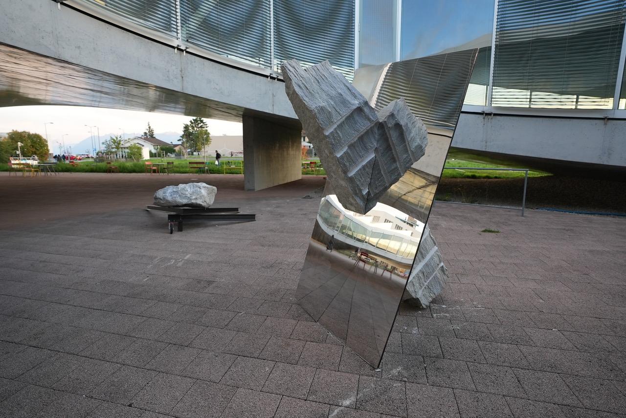 Séverin Guelpa, Drift, exposition Tremblement, 2025, pierre, bois, métal, surface miroitante, dimensions variables. © Séverin Guelpa