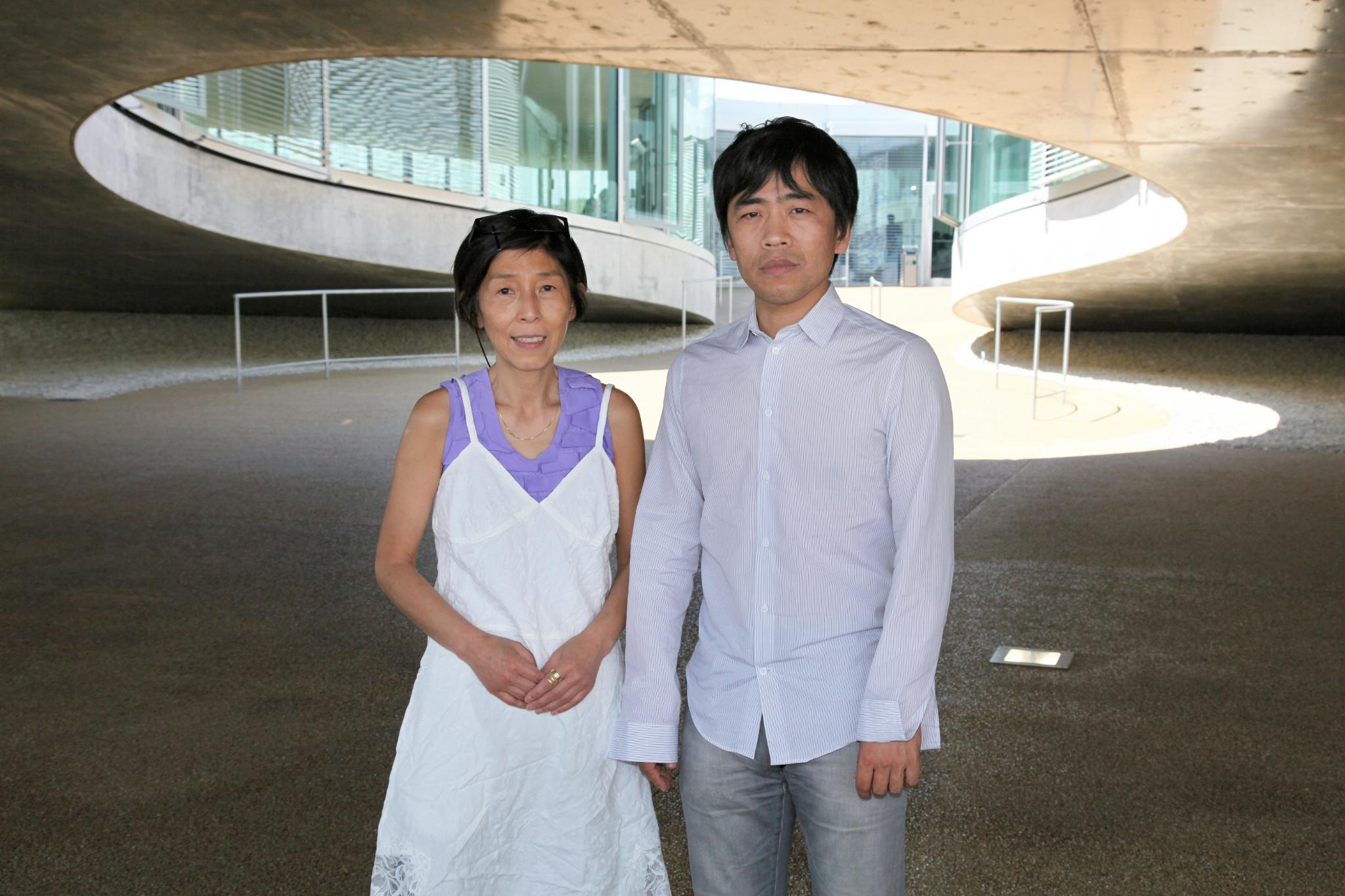 Architects Kazuyo Sejima and Ryue Nishizawa in front of the RLC © Alain Herzog, EPFL 2010