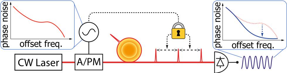 The researchers input microwave signals from an off-the-shelf oscillator to the laser to trap the pulses in the microresonator. As a result, the timing of the pulses could be regulated by the input signals. Detecting the disciplined pulses with a photodetector, the team was surprised to find that they could generate microwave signals with the same frequency but much lower phase noise.
