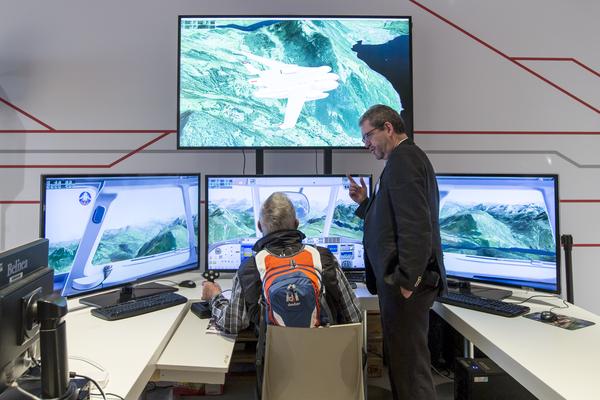 Visitors were able to fly the modular airplane Clip-air, with the "pilot" of the project, Claudio Leonardi, from the Informatics and Visualization Laboratory. ©Keystone