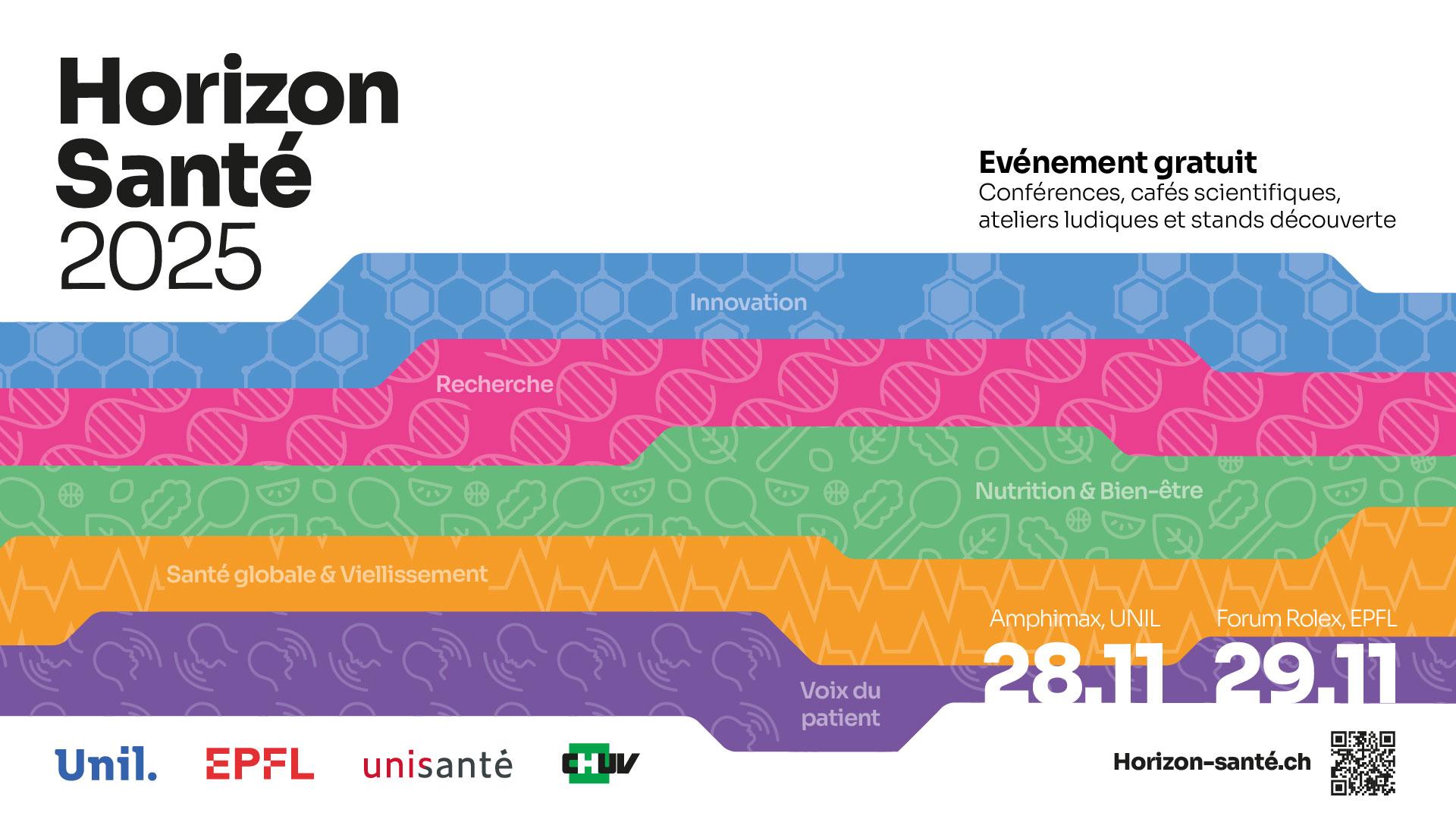 C’est pourquoi quatre institutions majeures ont uni leurs compétences pour proposer au grand public Horizon Santé 2025, un événement pour comprendre et discuter de ces questions, et de bien d’autres, les 28 et 29 novembre prochains. Vendredi 28, un cycle de conférences se tiendra à l’UNIL, tandis que le samedi 29, à l’EPFL, stands découverte, interventions d’experts, cafés scientifiques et ateliers ludiques pour les plus jeunes se succéderont. Le public pourra écouter des expertes et experts scientifiques et médicaux, ainsi que les témoignages de patientes et de patients.