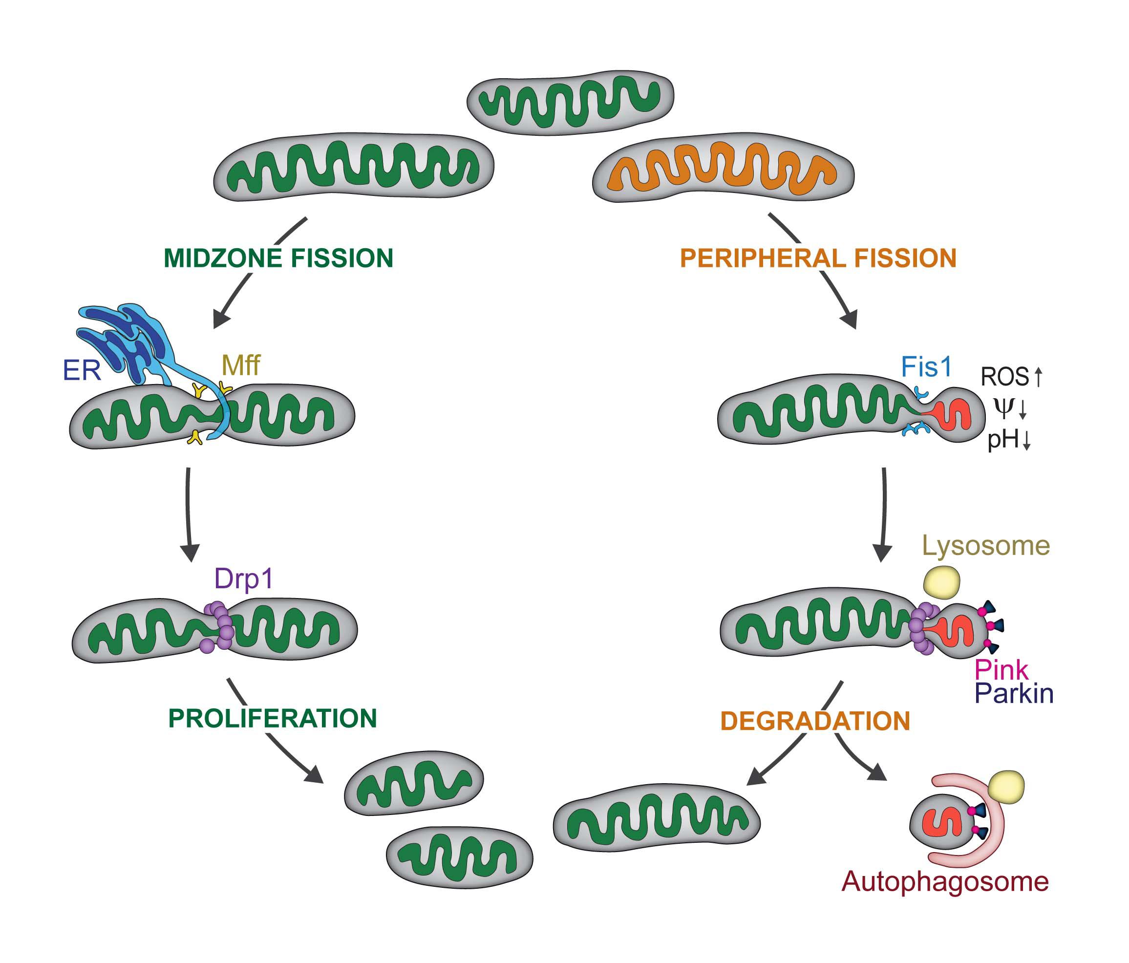 They observed two types of mitochondrial division: midzone and peripheral. They discovered that midzone division of mitochondria has all of the textbook molecular machinery of fission. In contrast, peripheral division is associated with mitochondrial stress and dysfunction, and the smaller daughter mitochondrion is subsequently degraded.