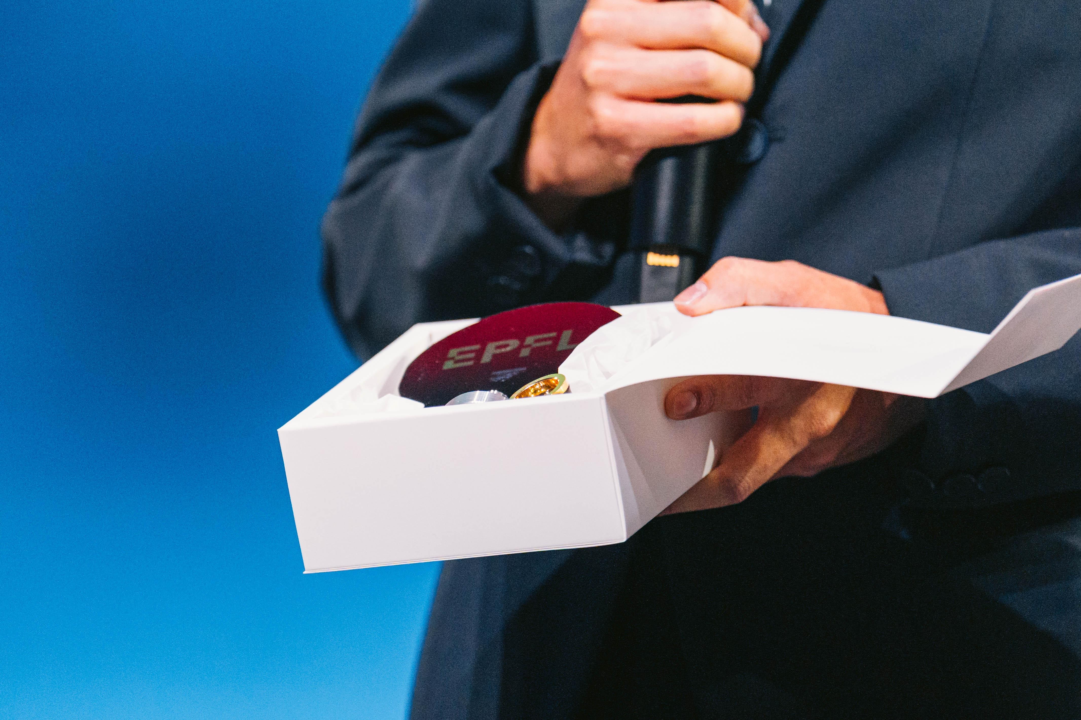 Le parcours de certains alumni se distingue par leur caractère exceptionnel. Après un Master à l’EPFL en 2012 puis un doctorat en astrophysique à Paris-Saclay, Gaëlle Giesen s’est orientée vers l’ingénierie spatiale où elle travaille sur deux grandes missions internationales.En parallèle, elle se passionne pour la plongée et le parachutisme, domaines dans lesquels elle excelle également. Steve Anavi, diplômé en microtechnique de l’EPFL en 2006, a lancé la start-up Qonto en 2016. Spécialisée dans la finance en ligne, elle est passée en 2022 au statut de licorne, nom donné aux jeunes pousses valorisées à plus de 1 milliard de dollars avant leur entrée en bourse. Le trophée que ces deux alumni ont reçu symbolise une expérience formatrice et collaborative, puisqu’il a été conçu dans le cadre d’un projet en sciences humaines et sociales de niveau bachelor qui regroupe des étudiants de tous les domaines. ll s’agit d’un wafer - un disque de silicium utilisé pour la fabrication de composants électroniques - personnalisé.