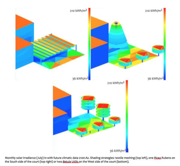 Pour parer aux chaleurs estivales qui vont aller crescendo, outre l’isolation des bâtiments, l’étude montre qu’il faudra transformer les extérieurs en réfléchissant à l’ombrage, poser des éléments de protection en fonction du rayonnement solaire, de l’orientation ou de la saison. Pour la chercheuse il n’y a pas besoin de planter et d’arboriser à tout va. Il faut réfléchir aux essences qui améliorent le confort. La densité du feuillage, la hauteur d’une plante et d’autres spécificités peuvent être prises en compte. Un exemple : en remplaçant l’asphalte par du gazon on change drastiquement la perception thermique.