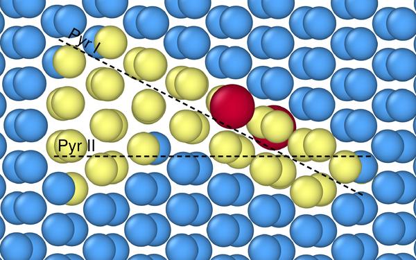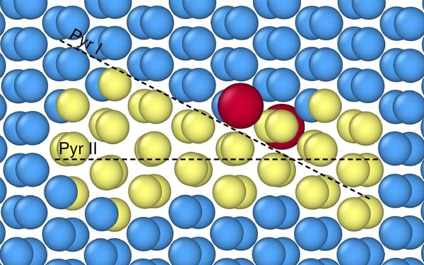 The two figures show the initial and final atomic configurations of the "cross-slip" process in the presence of two Yttrium atoms. Blue atoms are Mg atoms that are nearly in the perfect Mg crystal environment, yellow atoms are Mg atoms that are far from the perfect Mg crystal environment, and so indicate the structure and atoms involved in the "dislocation" defect. Red atoms are two Y solutes.