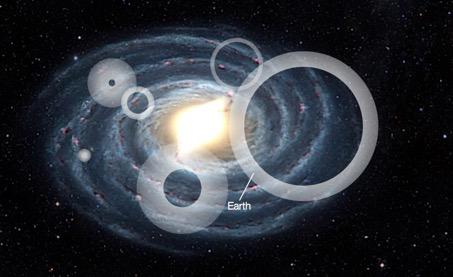Picture: Schematic view of the Milky Way showing six isotropic extraterrestrial emission processes forming spherical shells filled by radio signals. The outer radii of the spherical shells are proportional to the time at which the signals were first emitted, while the thicknesses are proportional to the duration of the emissions. In this example, the Earth is illuminated by one of these signals. ©Claudio Grimaldi.