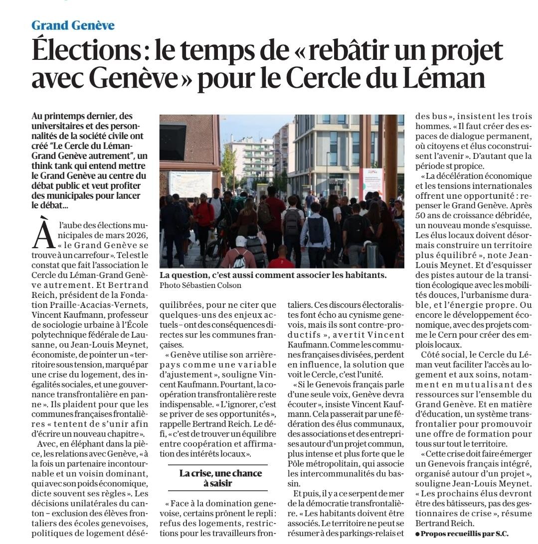 Vincent Kaufmann, professeur au Laboratoire de sociologie urbaine, appelle au sein du Cercle du Léman, à repenser le projet du Grand Genève avec ses habitants afin de renforcer la coopération transfrontalière et construire un territoire plus équilibré et durable.