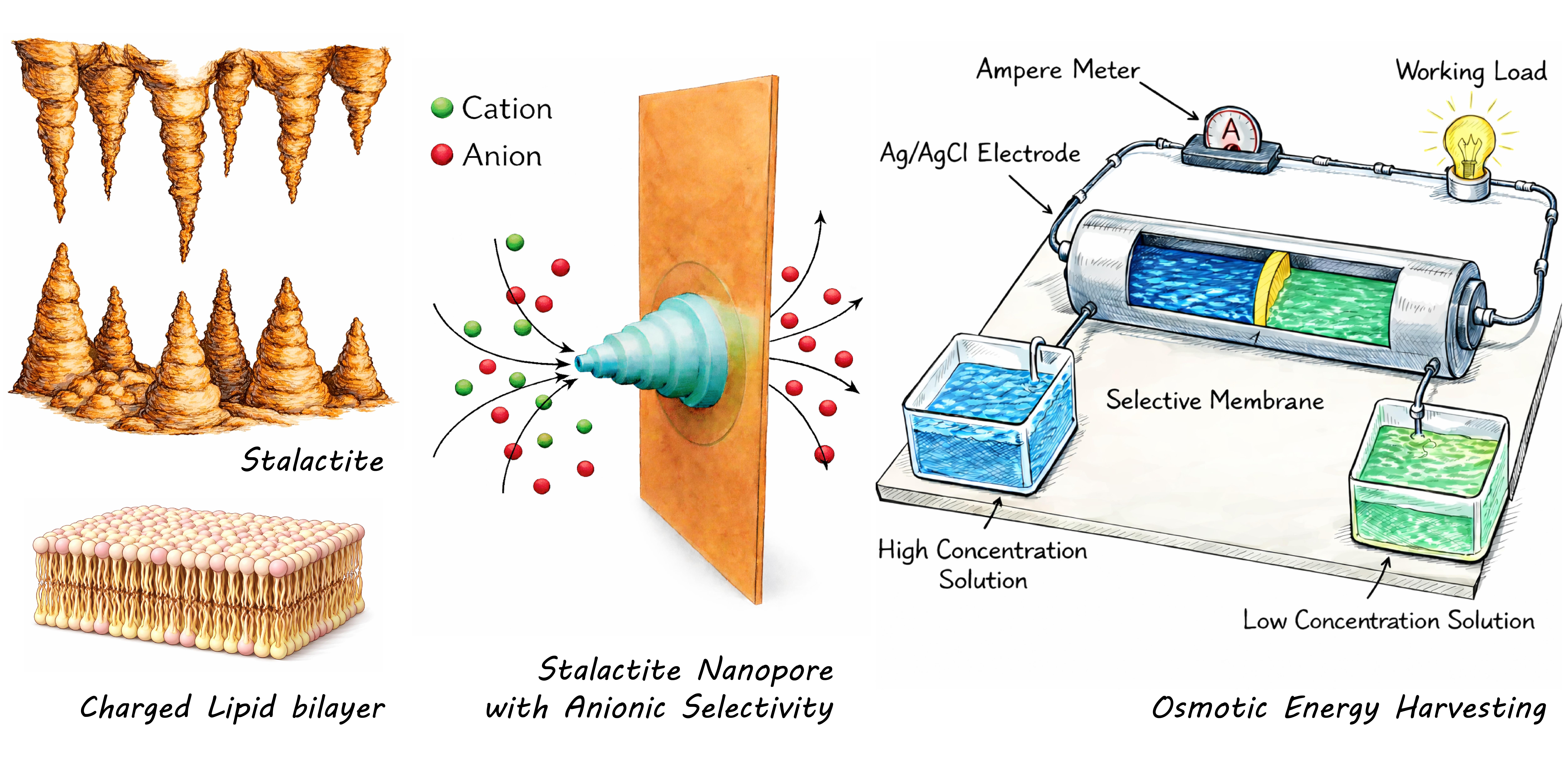 Osmotic energy, often called blue energy, is a promising way to generate sustainable electricity from the natural mixing of salt and fresh water. It exploits the voltage that arises when ions from salt water pass through an ion-selective membrane toward water with a lower salt concentration. However, membranes that let ions flow quickly are usually less selective, and challenges such as maintaining charge separation and mechanical robustness have kept most osmotic energy systems at the experimental stage.