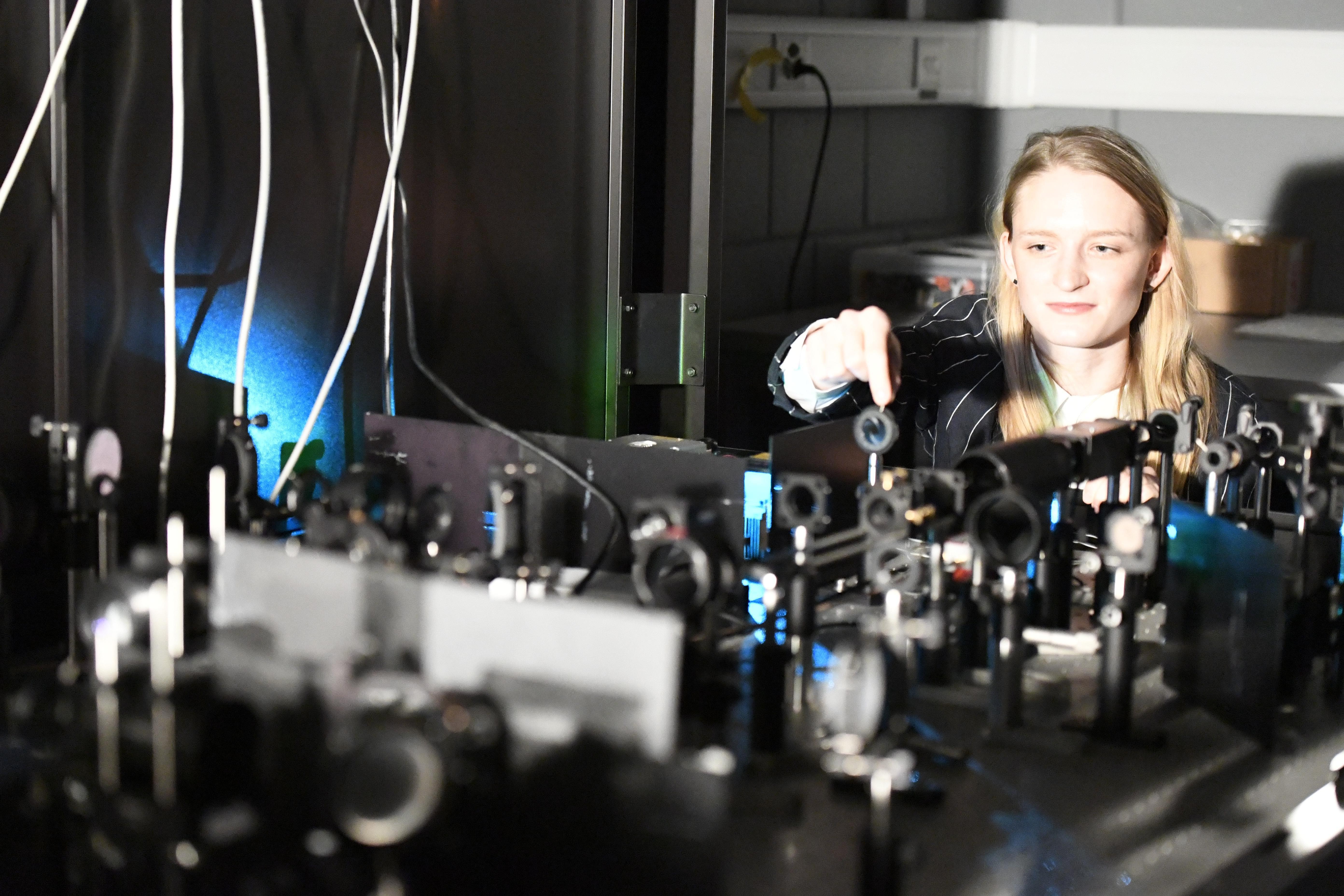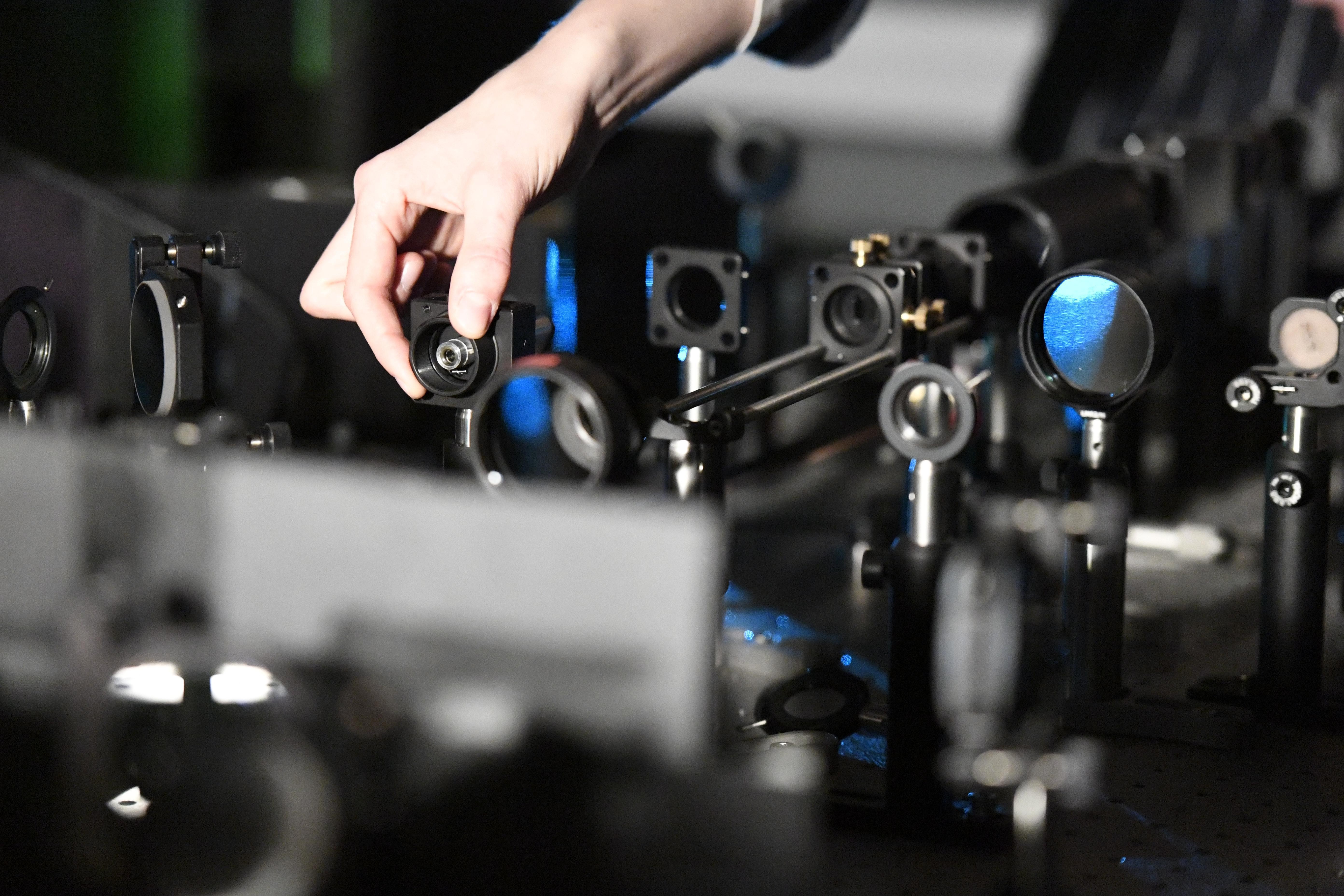 The microscope, a super-resolution fluorescence microscope, is not at all the typical optical microscope that one would see in an introductory biology class. It is actually a complex setup of carefully aligned mirrors and lenses that shape and deliver laser light into the specimen. The biophysicists combined this setup with advanced sample preparation that uses physical magnification of the sample and fluorophores to make proteins, the building blocks of life, re-emit light.