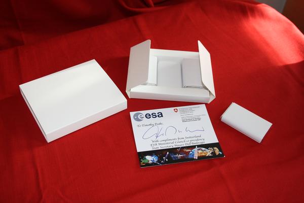 A chocolate box and card signed by Mauro Dell'Ambrogio, State Secretary for Education, Research and Innovation, that were sent to each of the six ISS astronauts. (c)SSC.