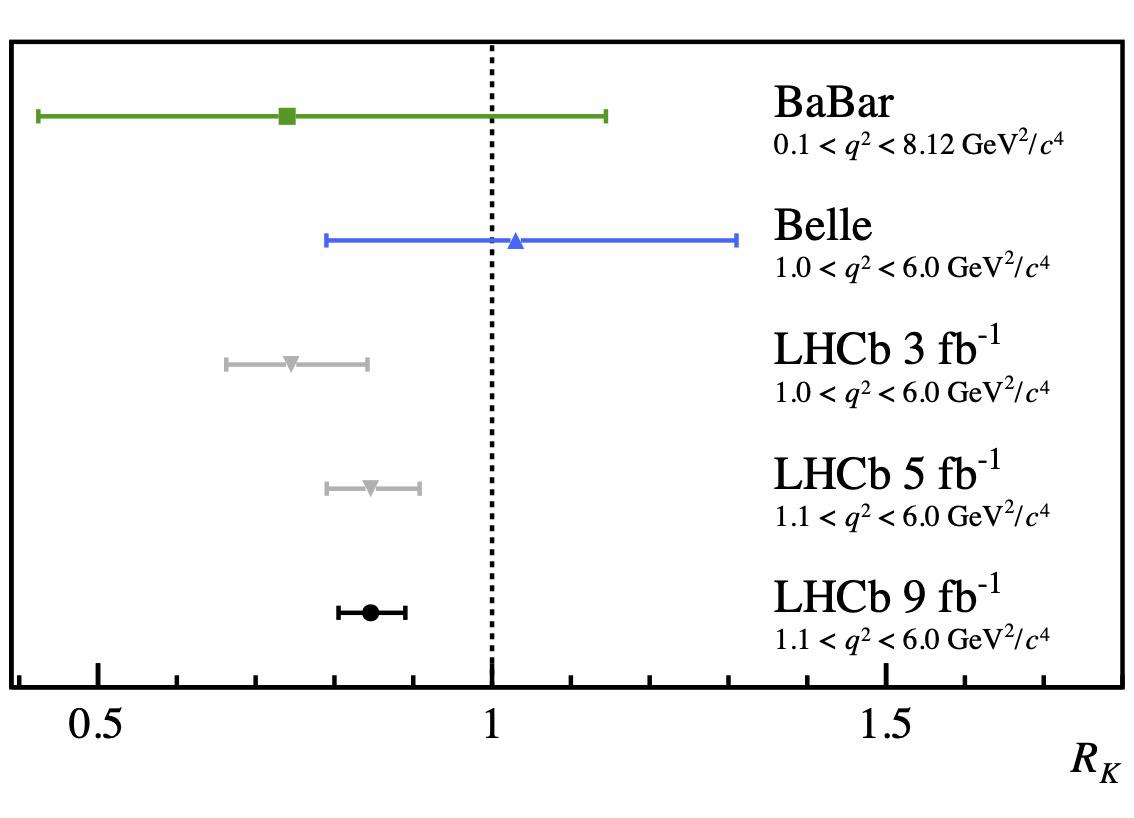 The measurement compares the decays of a B meson (containing a beauty quark, b) to a K meson and a pair of electrons with those having a pair of muons instead. A muon is an elementary particle identical to an electron apart from its mass, which is about 200 times larger. The Standard Model of particle physics treats all leptons (i.e. the electron, the muon, and even the heavier tau lepton) in the same way, except for differences due to their masses. This property of the Standard Model is called lepton universality. Since the b quark is heavy compared to electrons and muons, it is expected to decay with the same rate to these two lepton types, and the ratio, called RK, between the two decay probabilities is predicted to be almost equal to one. In the updated analysis, which uses all the data collected by the LHCb detector so far, this ratio was measured with much higher precision compared to previous results. The new result deviates from one with a statistical significance of 3.1 standard deviations, hence indicates evidence for violation of the lepton universality in beauty meson decays. This corresponds to a probability of about 0.1% that the data are compatible with the Standard Model expectation. Lepton universality violation would imply physics beyond the Standard Model such as a new fundamental force in addition to the known gravitational, electromagnetic, weak and strong interactions. However, more data and complementary measurements are needed to confirm this conclusion.