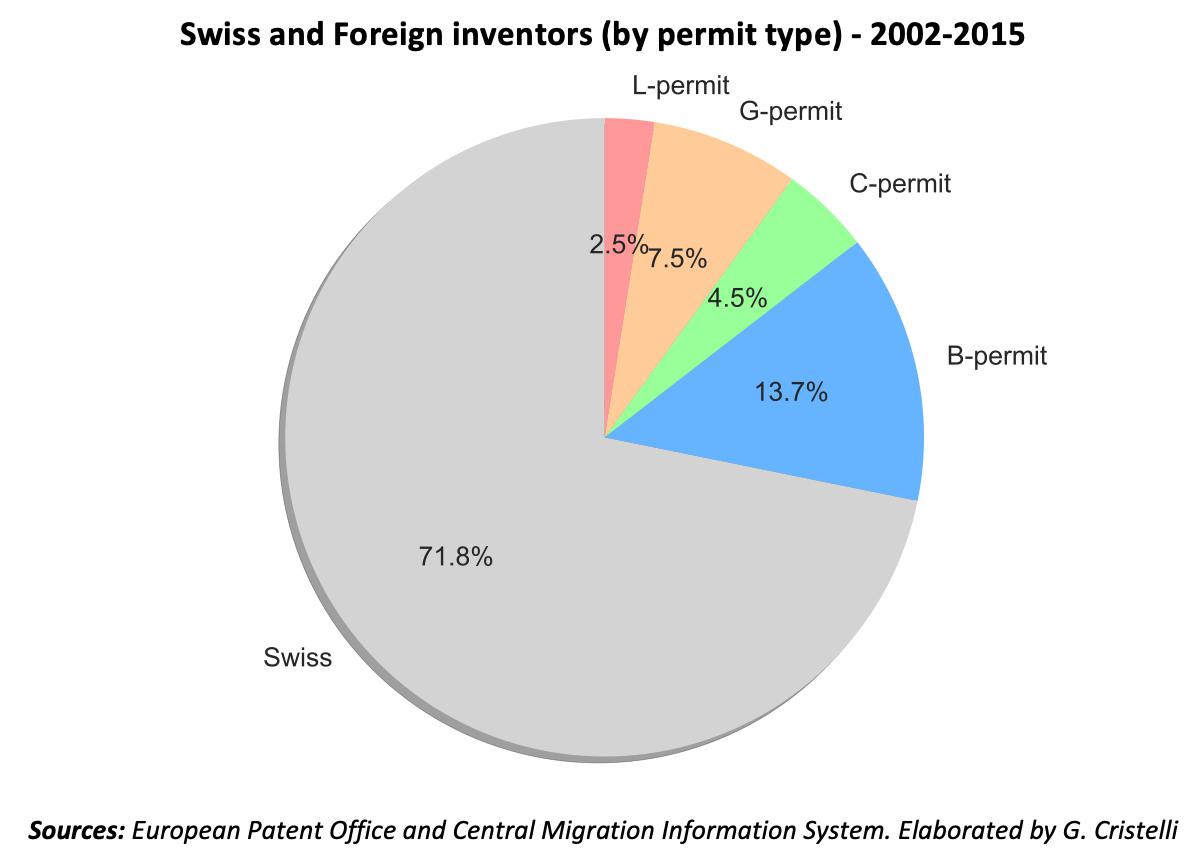 A preliminary analysis of roughly 50,000 patents filed by Swiss firms between 2002 and 2015 reveals that almost 30% of inventors active in Switzerland during that period held an immigrant permit B, C, G, or L. This makes Switzerland one of the countries with the highest proportion of foreign inventors in the world.