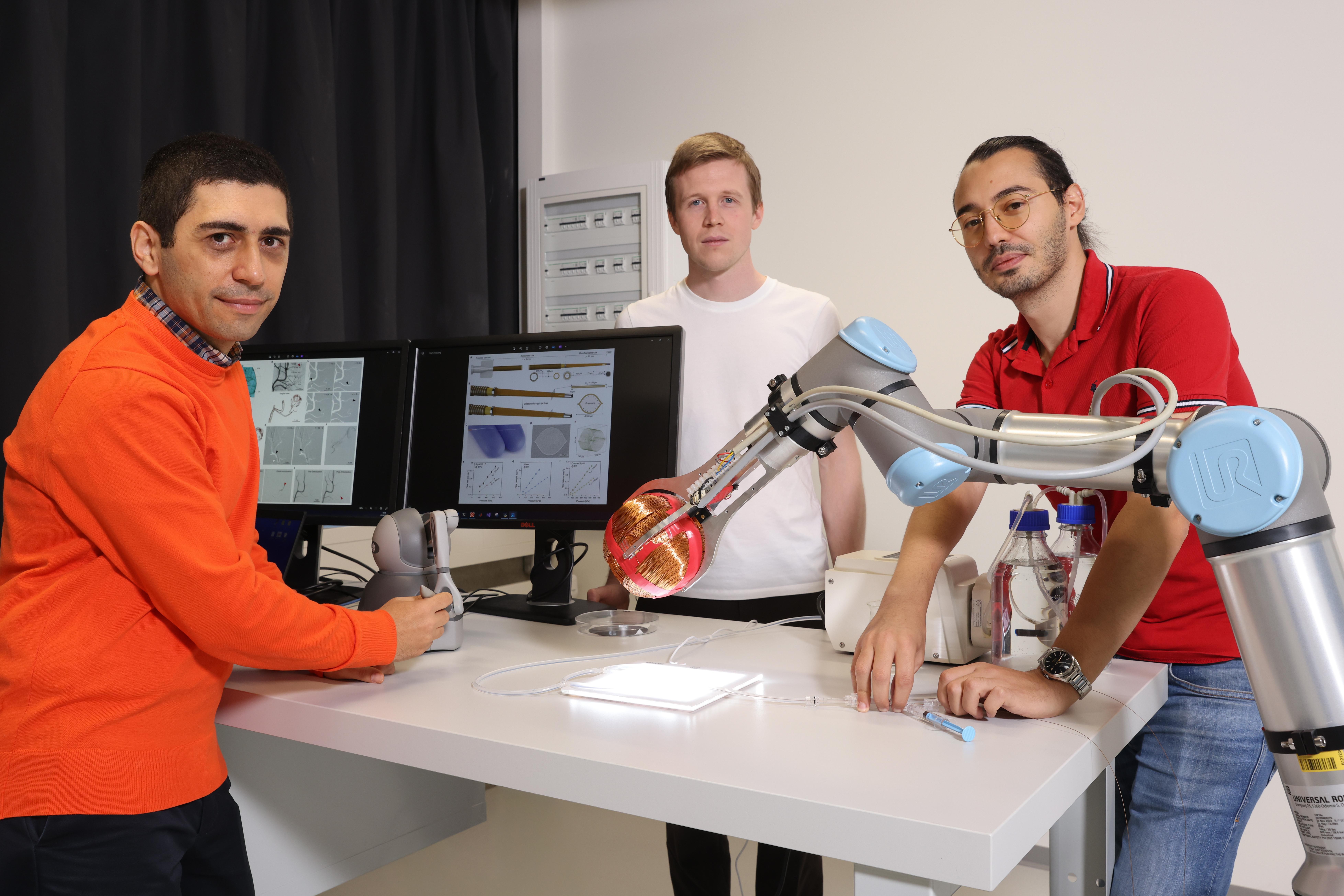 Jusqu’à présent, les neuroradiologues interventionnels utilisaient des fils-guide pour acheminer minutieusement les microcathéters à travers les méandres tortueux des vaisseaux sanguins à l’aide d’une technique fastidieuse de poussée-traction-rotation, qui risquait d’endommager les parois des vaisseaux. Mais ces instruments sont encore trop volumineux pour atteindre les vaisseaux sanguins les plus éloignés et les plus ramifiés du cerveau, qui peuvent avoir un diamètre inférieur à 150 microns, soit environ la taille d’un cheveu.