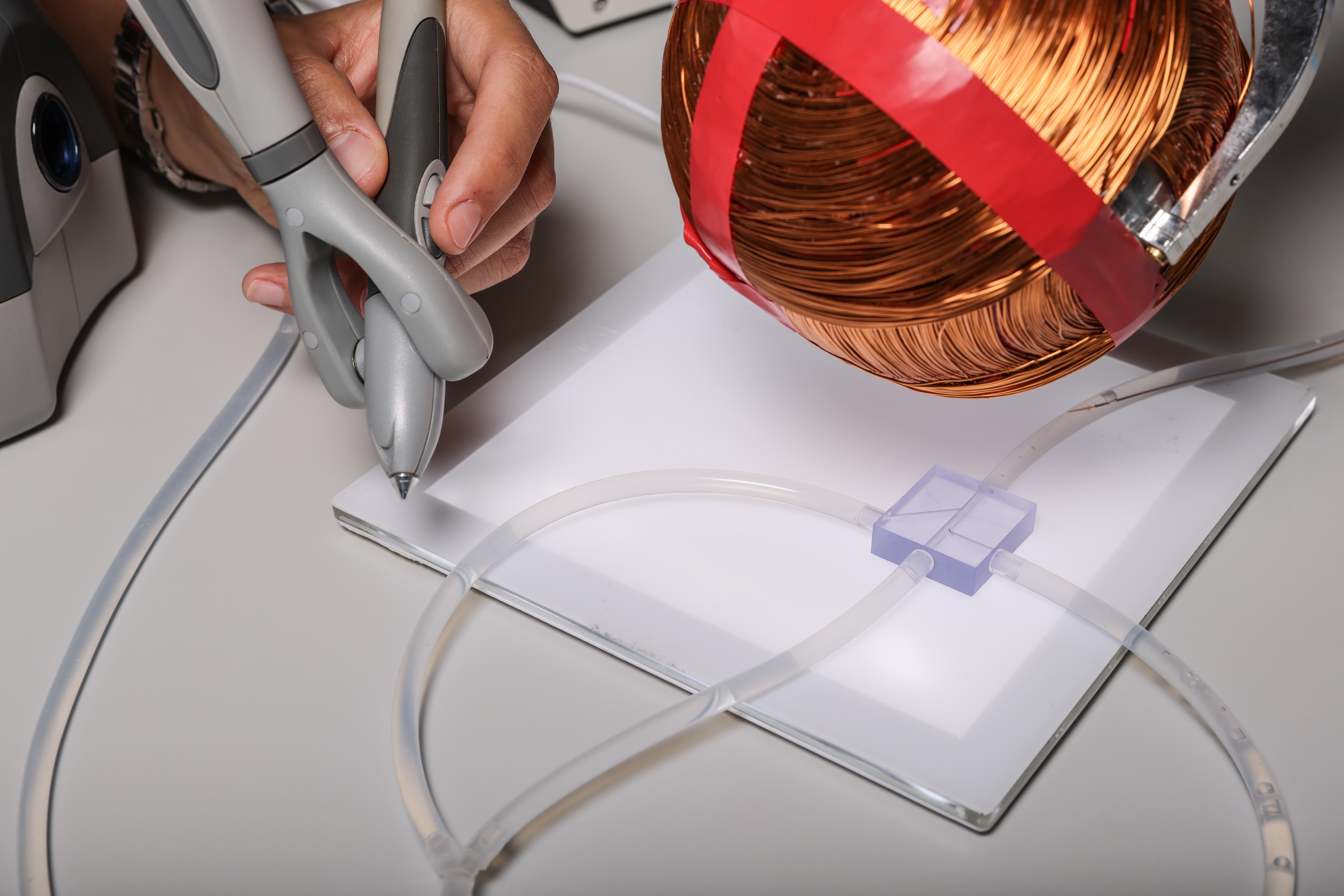 En parallèle, l’équipe de l’EPFL a développé une plateforme de pilotage robotisée, OmniMag, qui permet de guider le microcathéter au moyen d’un générateur de champ magnétique monté sur bras robotisé. À l’aide du mouvement de la main du médecin sur un stylet, OmniMag calcule automatiquement l’orientation du champ magnétique nécessaire pour orienter la pointe magnétique de MagFlow dans la direction souhaitée.