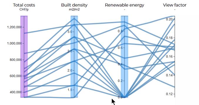 « La question n’est plus de décider si on veut construire ou non une tour, mais de d’abord définir les objectifs principaux à atteindre, comme la densification, la qualité de vie ou le coût, puis de demander au système de proposer les meilleures variantes », continue Sébastien Cajot. Visualiser les alternatives de manière simple, sur des axes verticaux, permet d’avoir une vision d’ensemble. Ainsi, une option répondant aux coûts et à la densité souhaités par l’urbaniste pourrait aussi montrer qu’elle ne répond plus aux normes légales en matière d’utilisation des énergies renouvelables, ou obstrue la vue de certains bâtiments. Les acteurs peuvent donc dynamiquement adapter les différents objectifs, afin d’identifier progressivement des solutions acceptables pour tous.