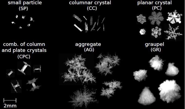 In collaboration with the Federal Office of Meteorology and Climatology MeteoSwiss and the Institute for Snow and Avalanche Research, they installed the MASC at a site near Davos, at an altitude of 2,500 meters, where it took pictures for an entire winter and at a site in coastal Antarctica, where it took pictures for an entire austral summer. They then ran their algorithm to classify the snowflake images into six main classes based on existing classification: planar crystals, columnar crystals, graupels, aggregates, combination of column and planar crystals, and small particles (image 2).