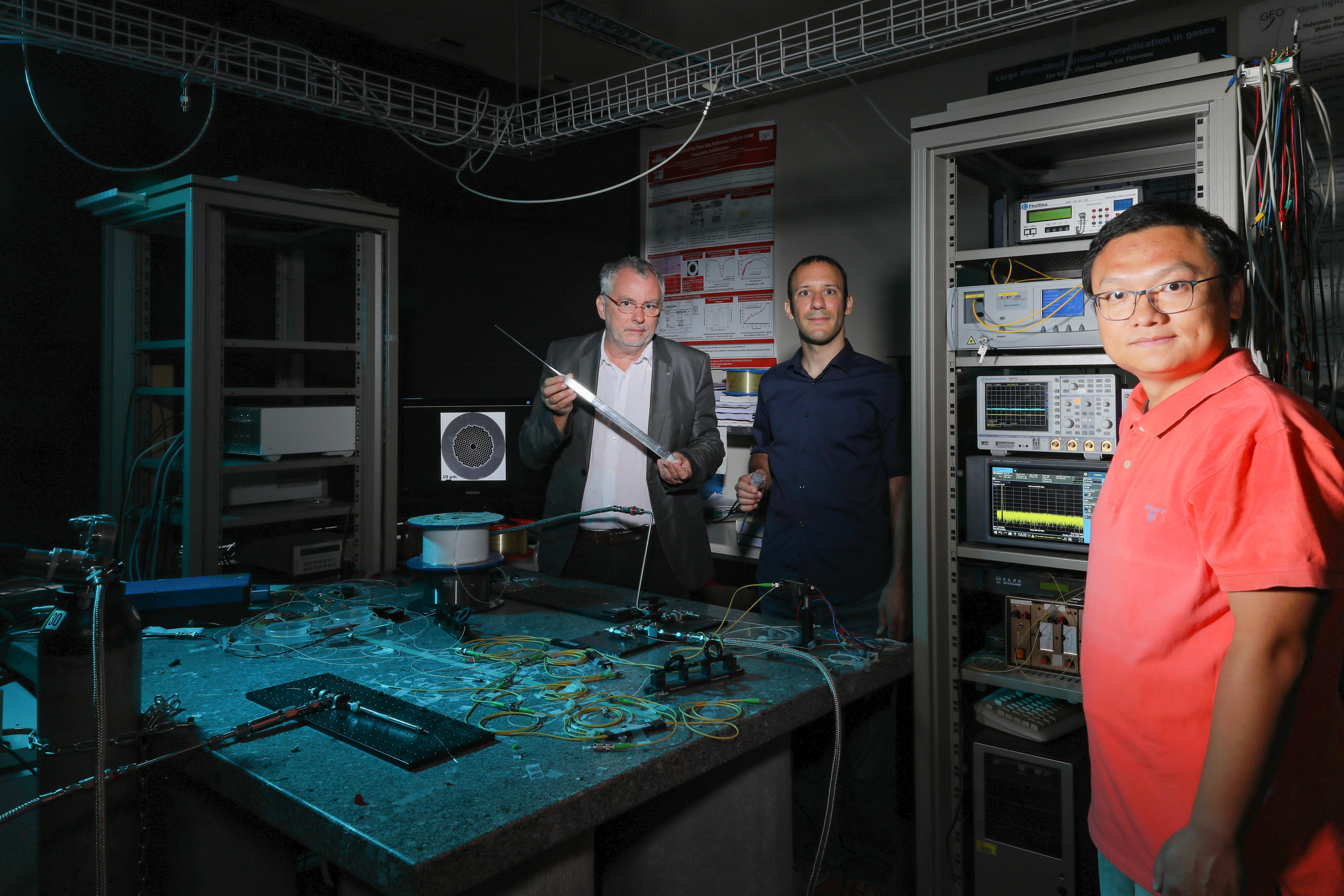 Thévenaz’s approach is based on new hollow-core optical fibers that are filled with either air or gas. “The air means there’s less attenuation, so the light can travel over a longer distance. That’s a real advantage,” says the professor. But in a thin substance like air, the light is harder to amplify. “That’s the crux of the problem: light travels faster when there’s less resistance, but at the same time it’s harder to act on. Luckily, our discovery has squared that circle.”