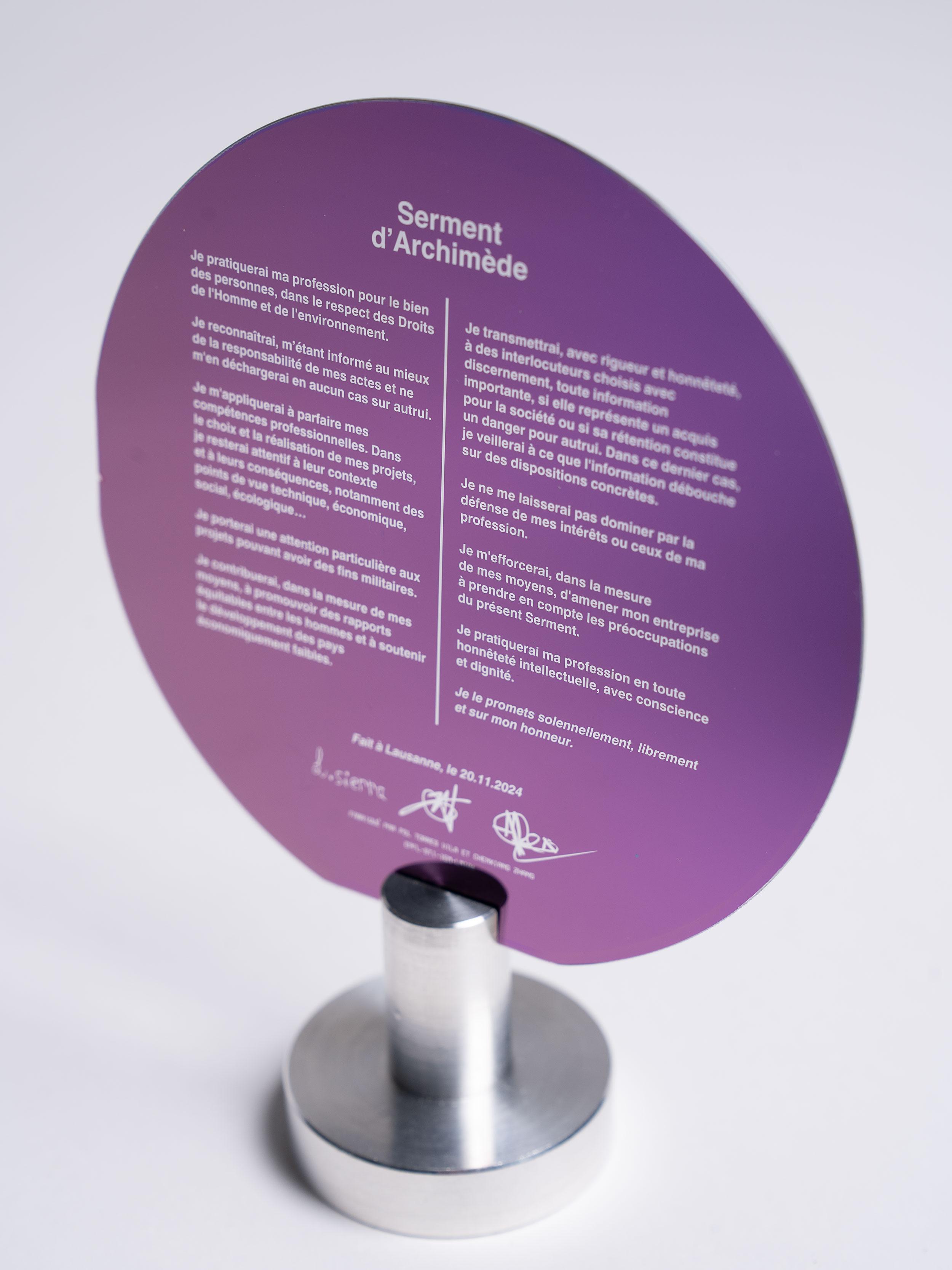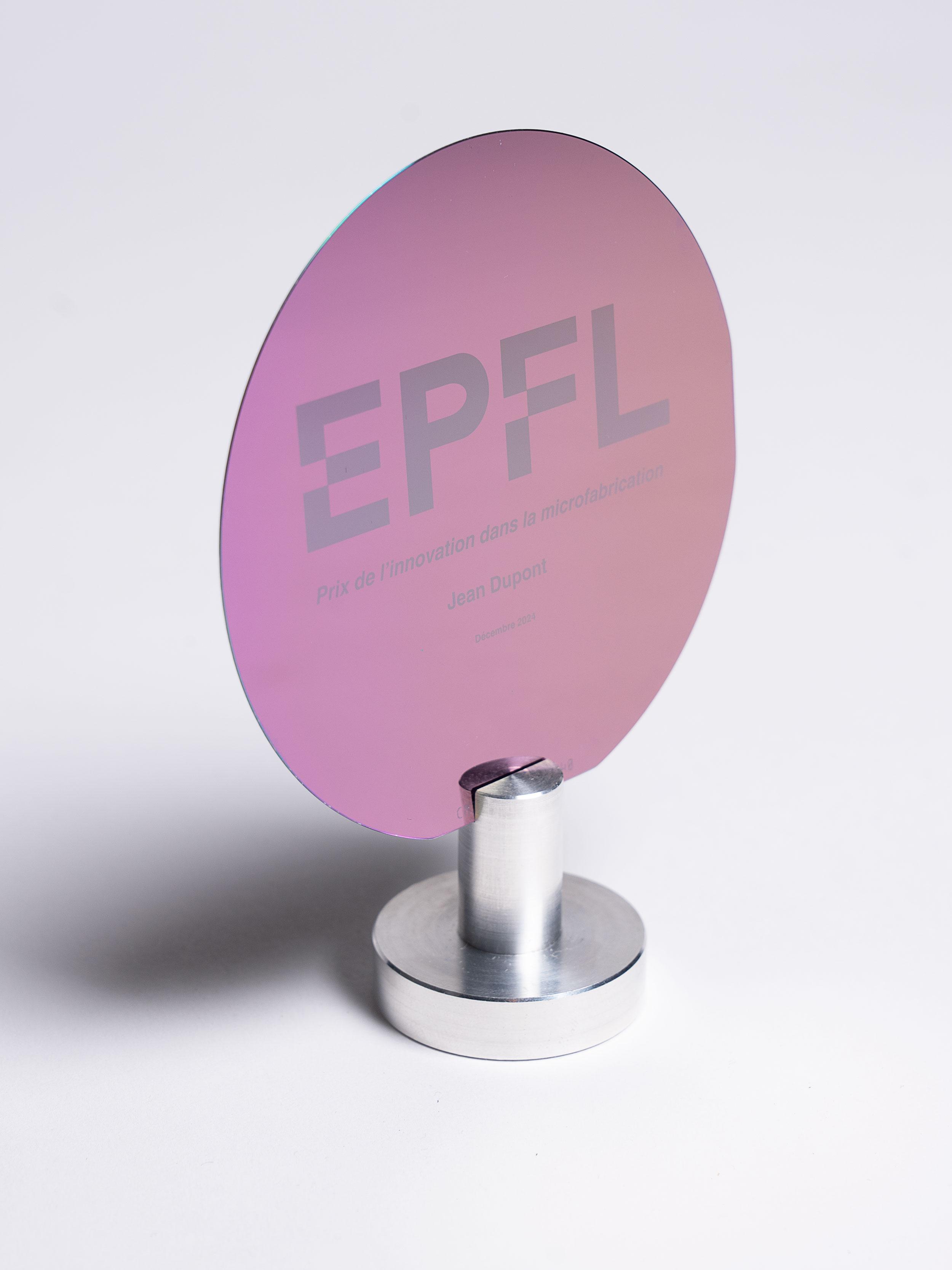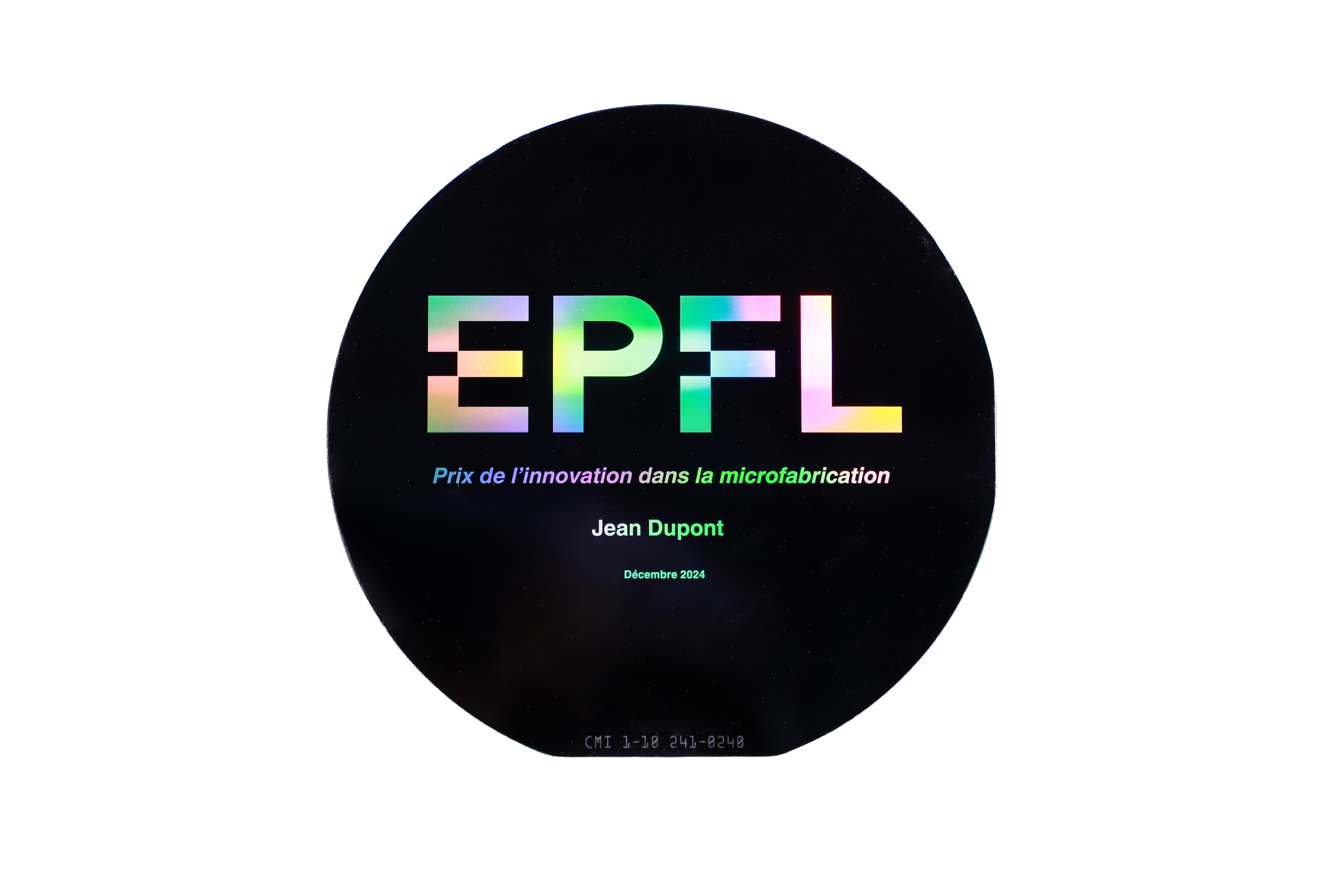 The team initially planned to use a combination of metals including gold and aluminum on the wafer surface, but that would have made the trophy’s cost prohibitive. Instead, they chose a more pragmatic approach. After spending weeks getting input from various experts, they decided to display the EPFL logo through diffraction on one side of the wafer. On the other side, the recipients’ names will be engraved in aluminum along with the signature of EPFL’s president, Anna Fontcuberta i Morral.