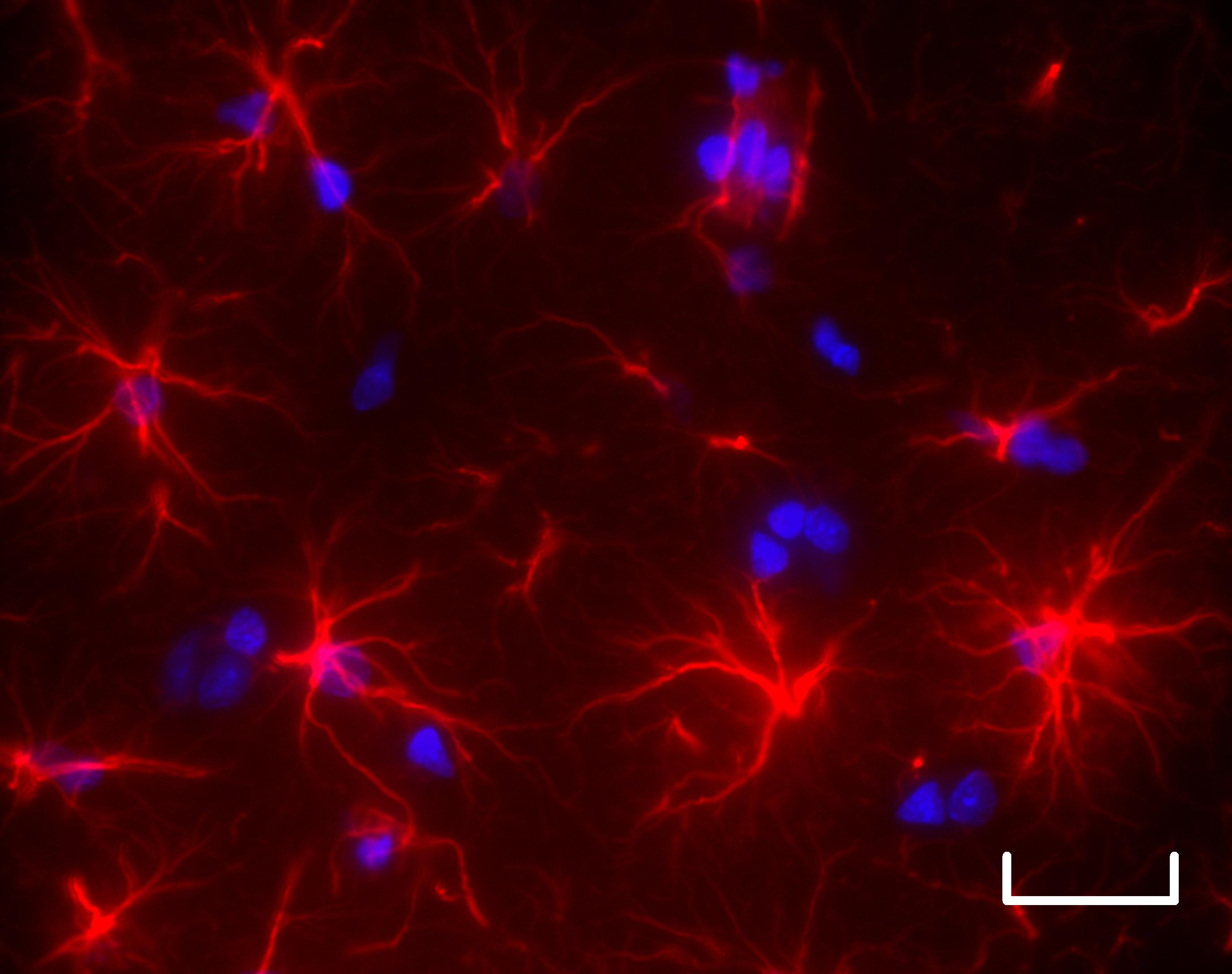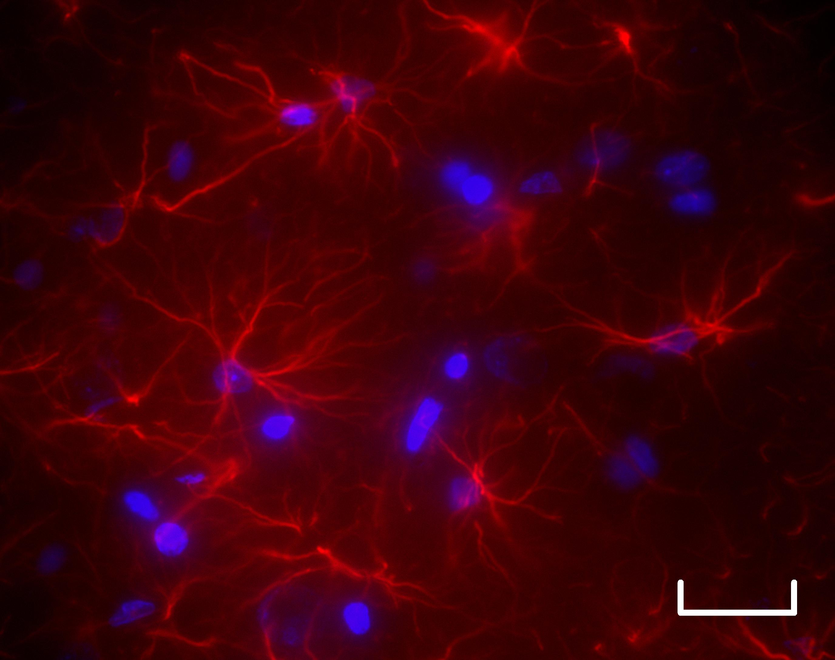 Four weeks after the onset of liver disease (bottom), astrocytic cells (red) in the brains of diseased rats show altered morphology with shortening and reduction in the number of their extensions (scale bar: 25 μm). © Katarzyna Pierzchala et Dario Sessa